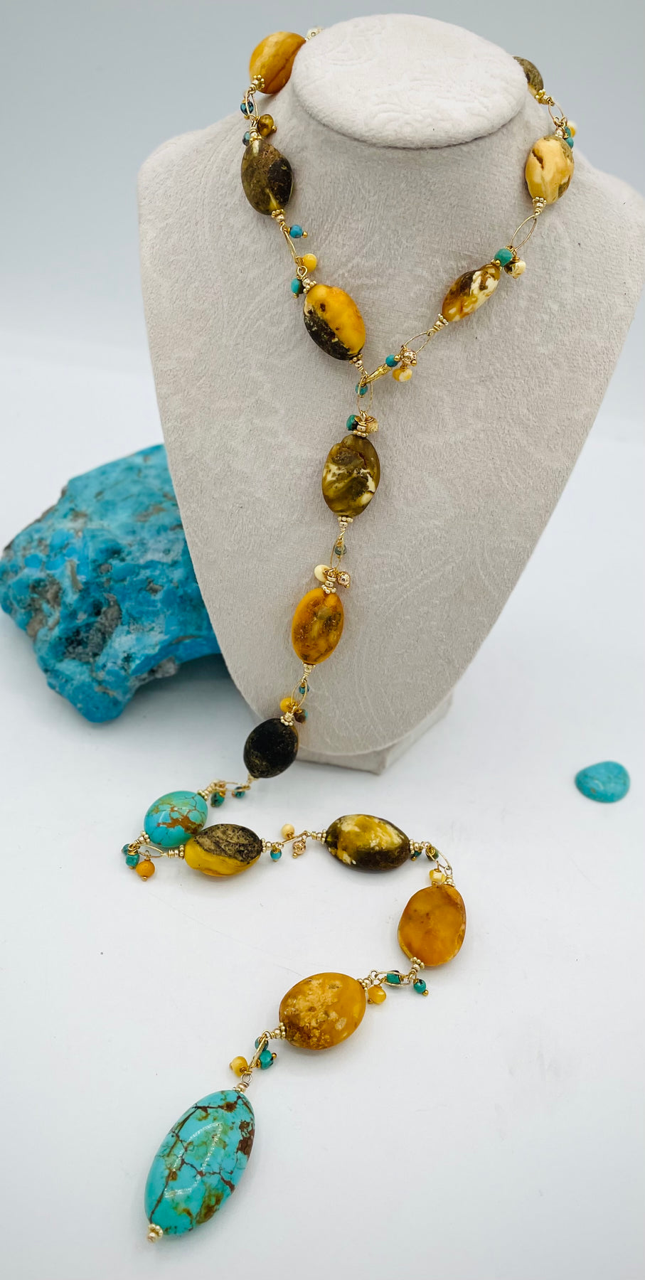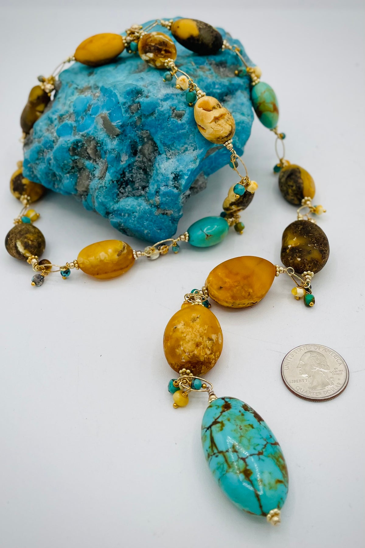 This handmade necklace features a colorful combination of beautiful yellow amber with black matrix, and blue kingman turquoise. This piece is hand wrapped on 14 karat gold chain and can be worn at any length. It measures 32 1/2 inches in length with a gold S hook.
