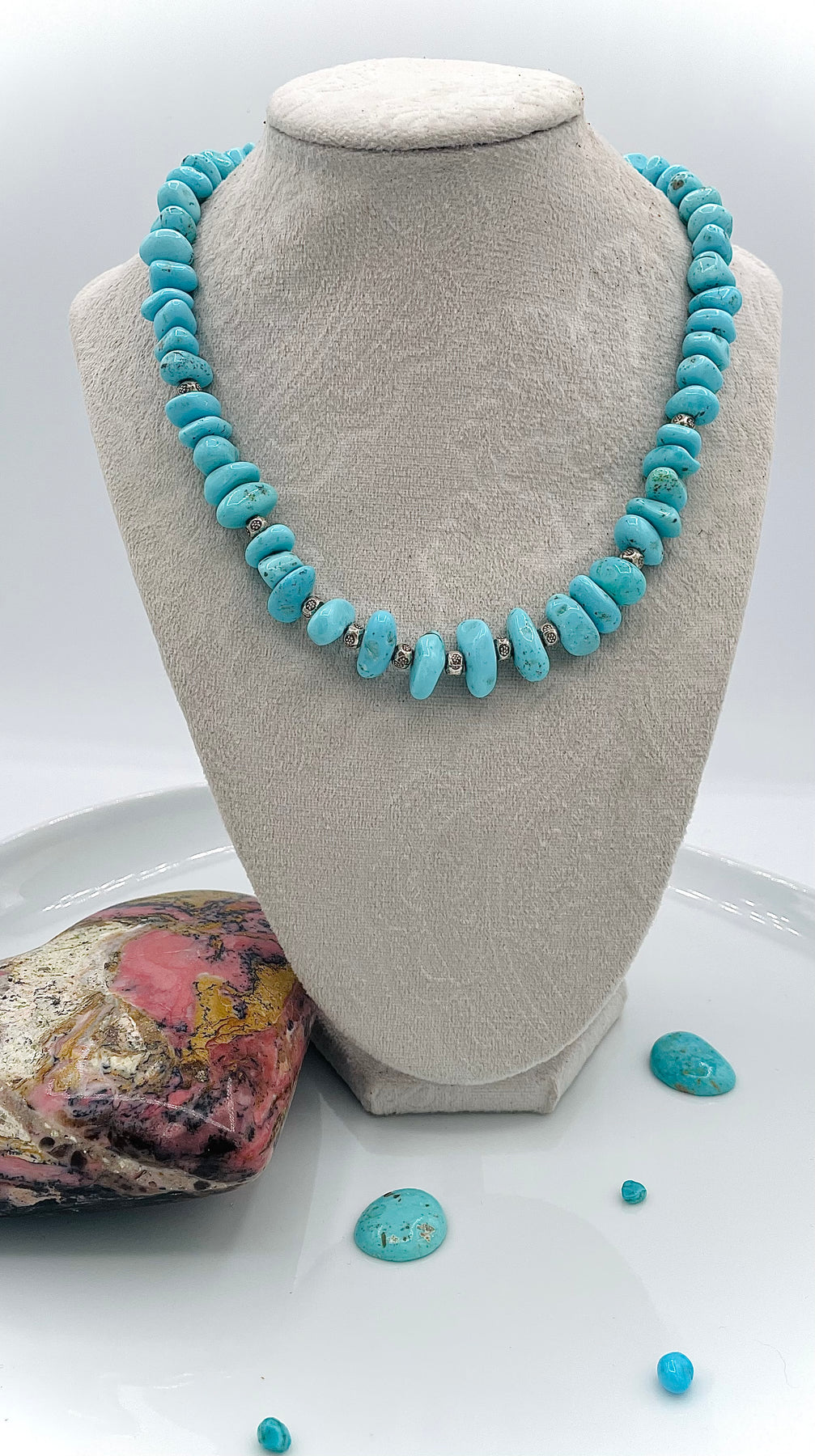 This handmade necklace features beautiful blue Campos’s turquoise with sterling silver accents. It measures 17 1/2 inches in length with an additional 2 inches of Sterling silver extension chain on the back.