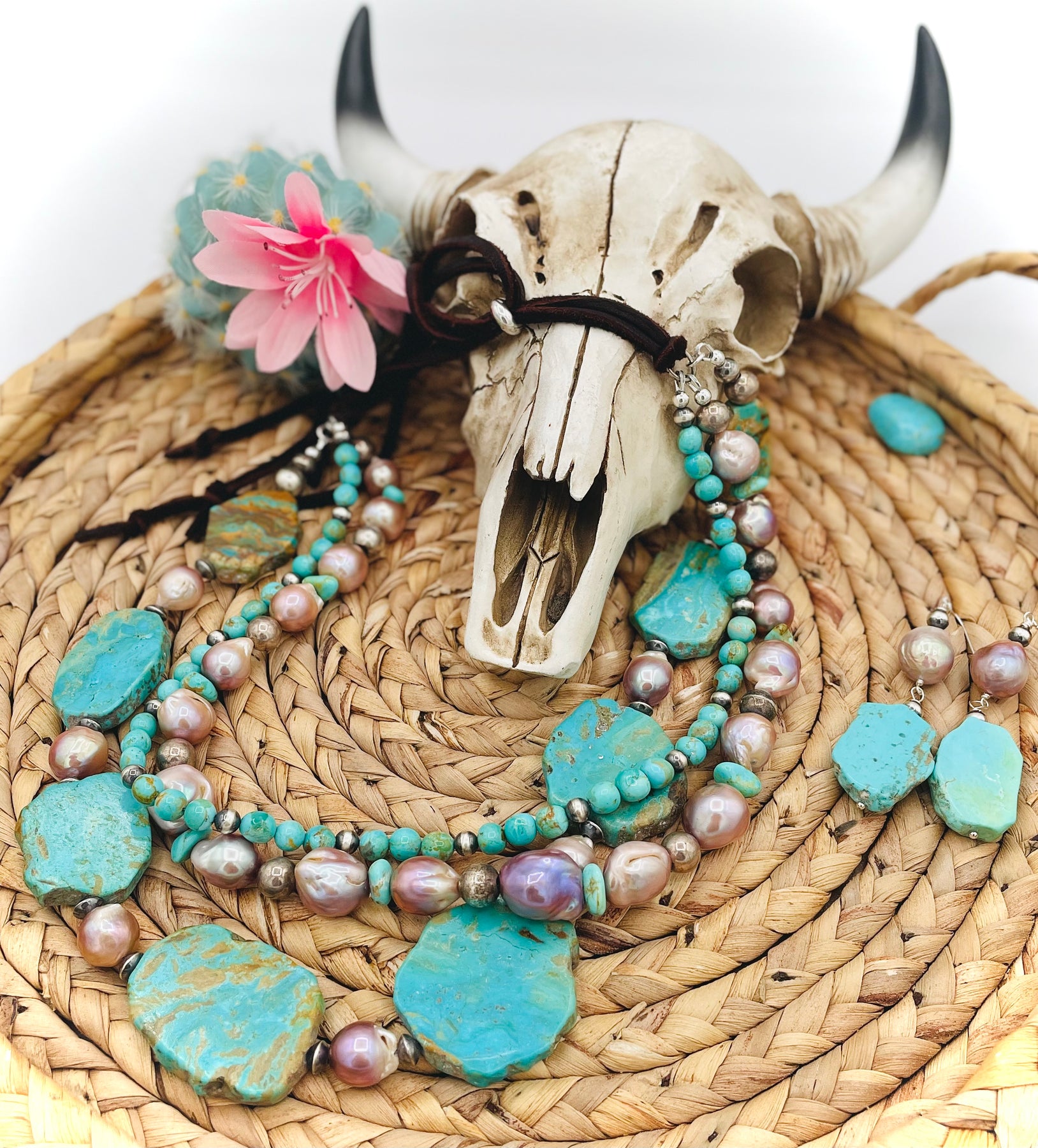 This handmade necklace and earring set features three strands of beautiful Kingman Turquoise with baroque pearls and sterling silver accents. This piece features dear lace with a silicone slide bead on the back so that its length can be customized to any size.
