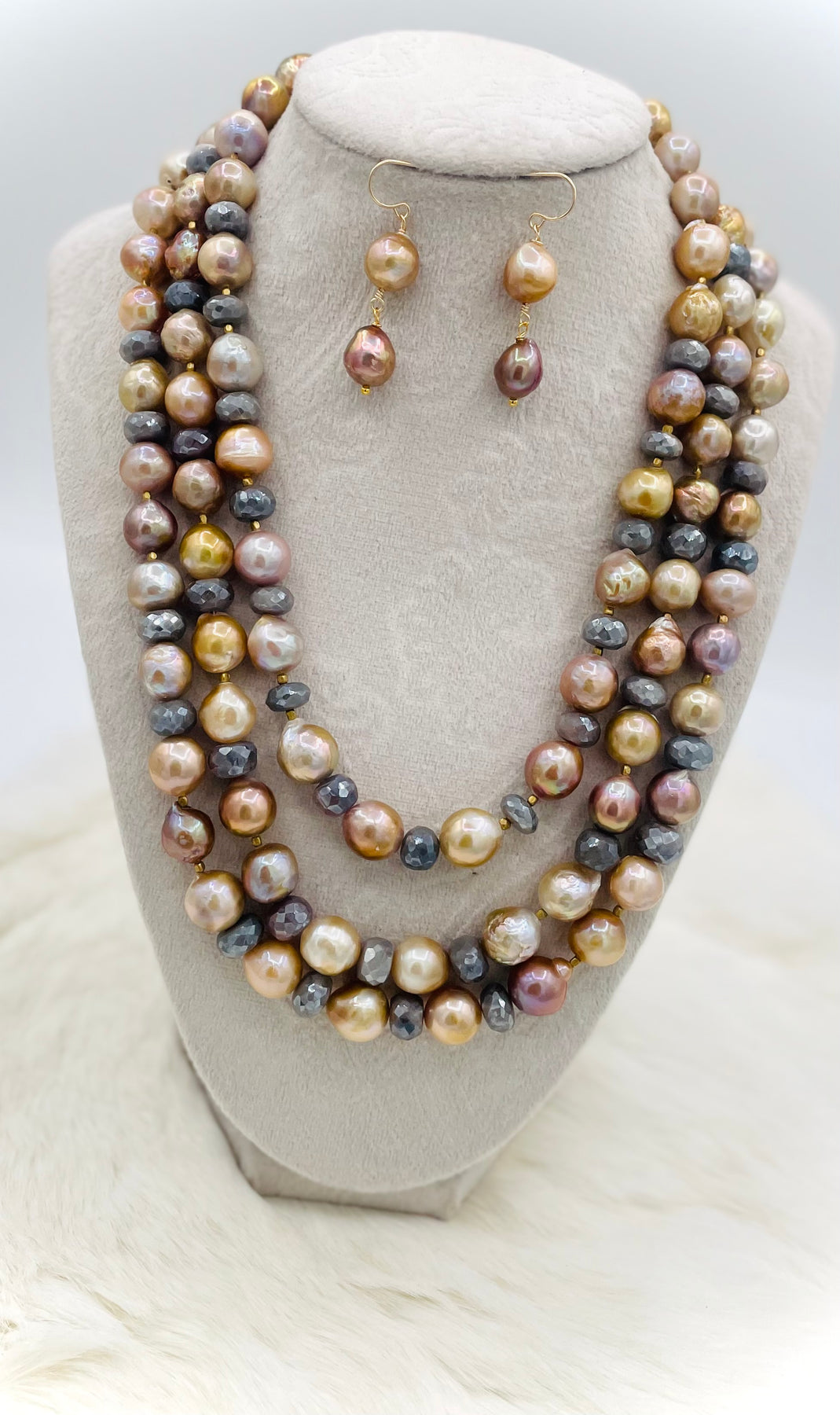 This handmade necklace features a collection of our natural luster pearls in all of our gold and pink shades with grey silverite and gold accents. This 3 strand necklace measures 18.5” to 22” in length with a 14 k gold toggle.
