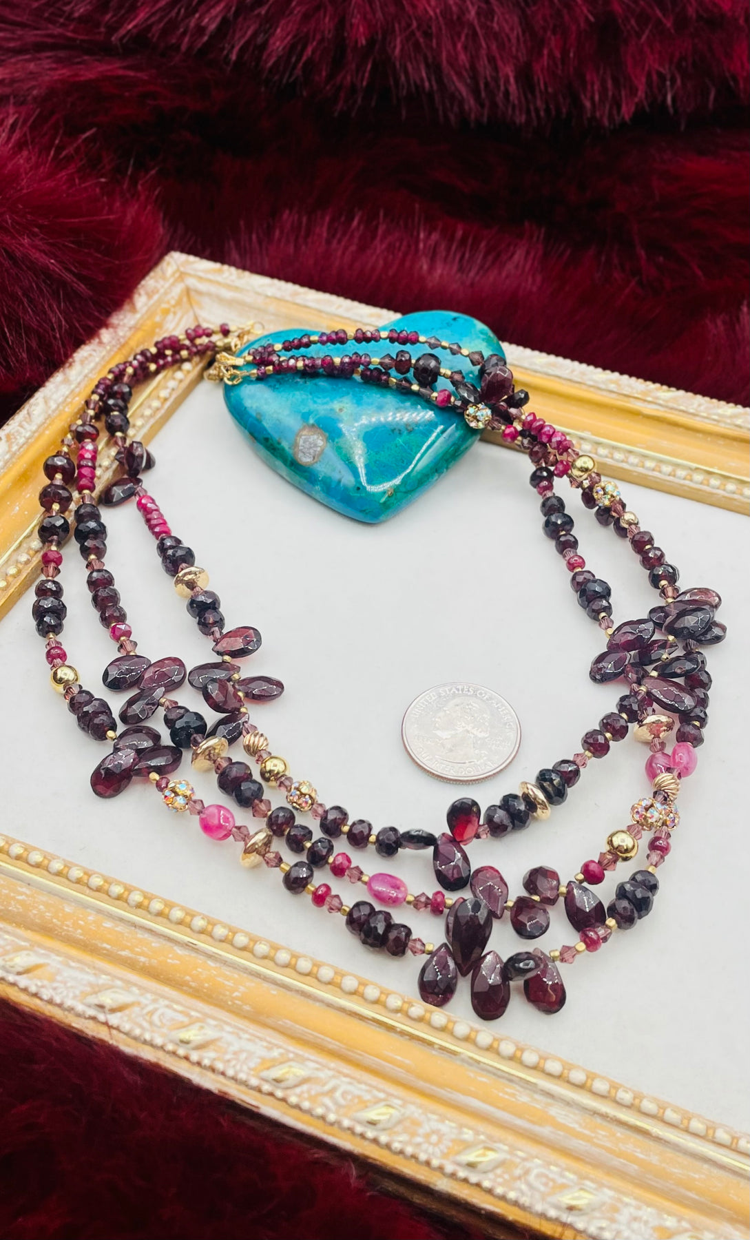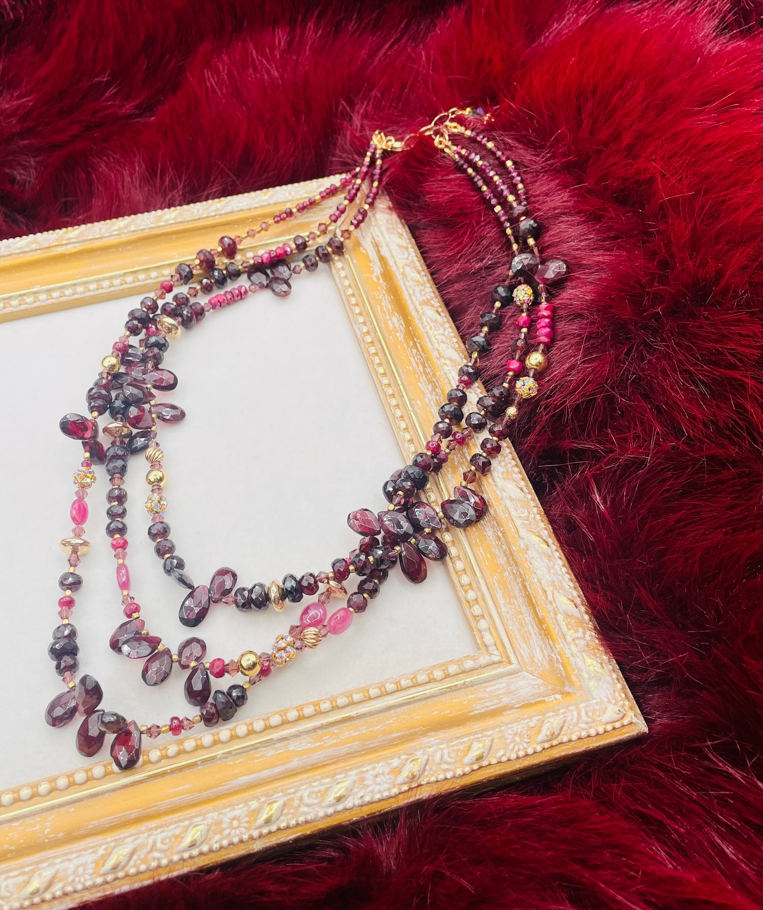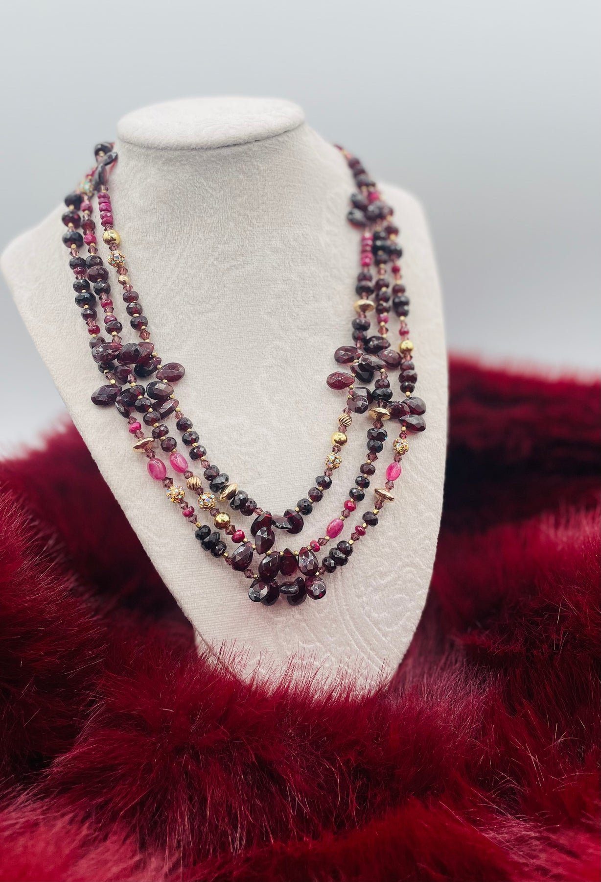 This handmade piece features a beautiful combination of red garnet with natural rubies and 14 karat gold. The inner strand measures 17 inches in length, the middle strand measures 18 inches in length and the outer strand measures 19.5 with a 14 k gold lobster clasp and 1 inch extension chain.
