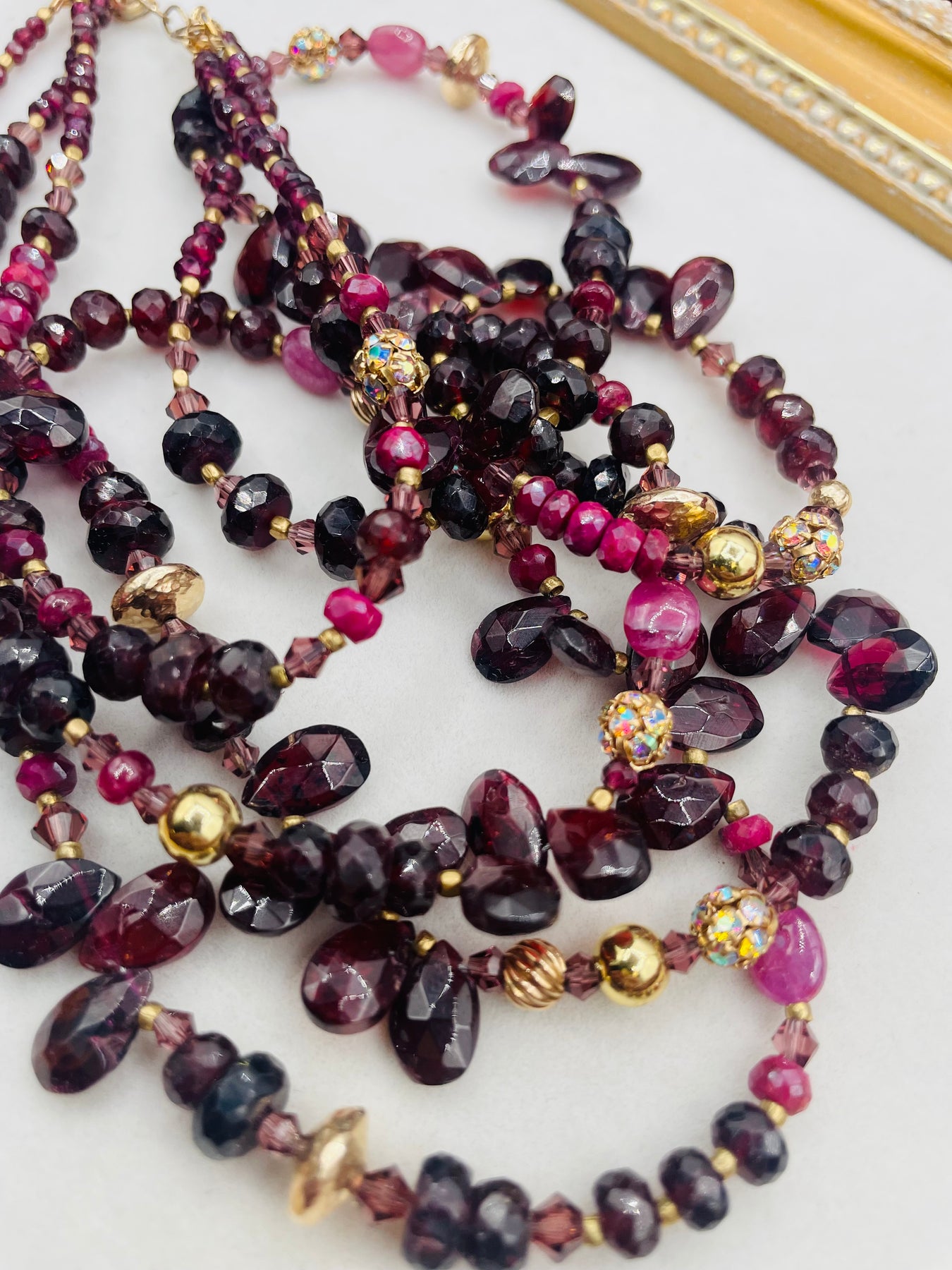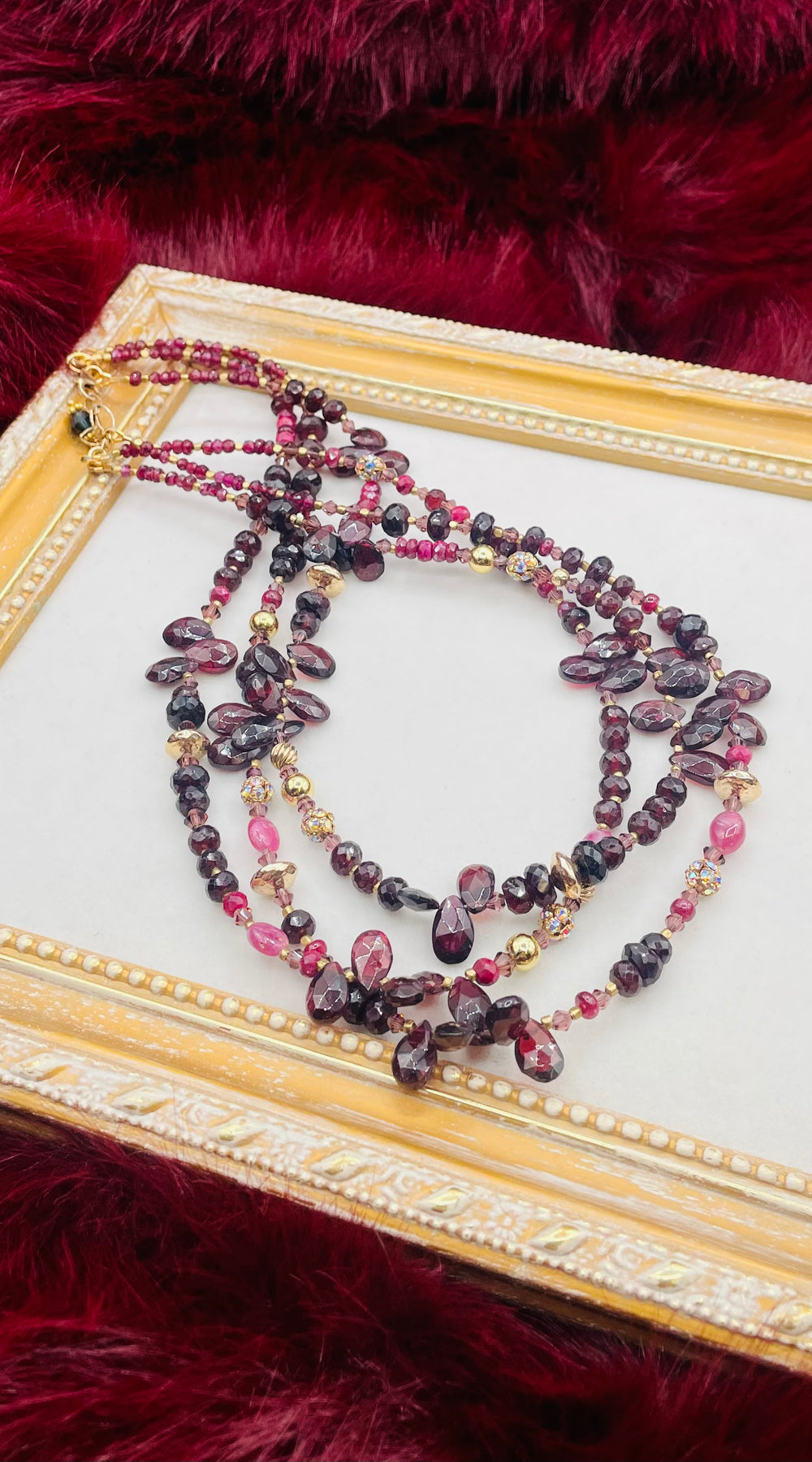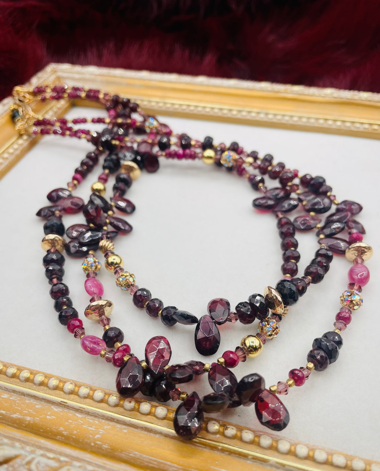 This handmade piece features a beautiful combination of red garnet with natural rubies and 14 karat gold. The inner strand measures 17 inches in length, the middle strand measures 18 inches in length and the outer strand measures 19.5 with a 14 k gold lobster clasp and 1 inch extension chain.