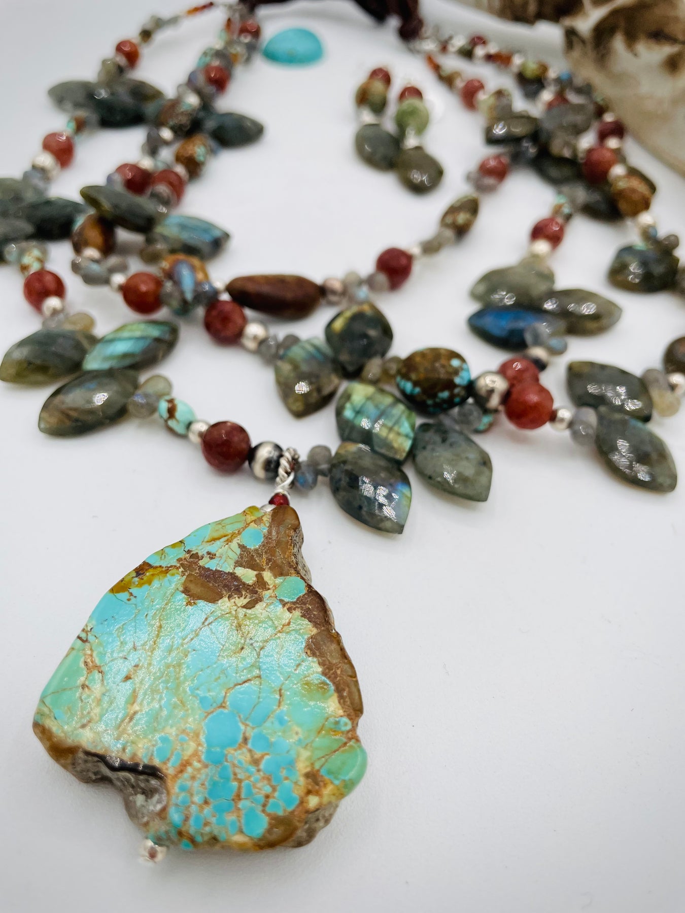 This handmade necklace Is a beautiful combination of vintage #8 turquoise and labradorite drops with sunstone and sterling silver accents. This necklace Features dear lace on the back so it can be customized to any length.