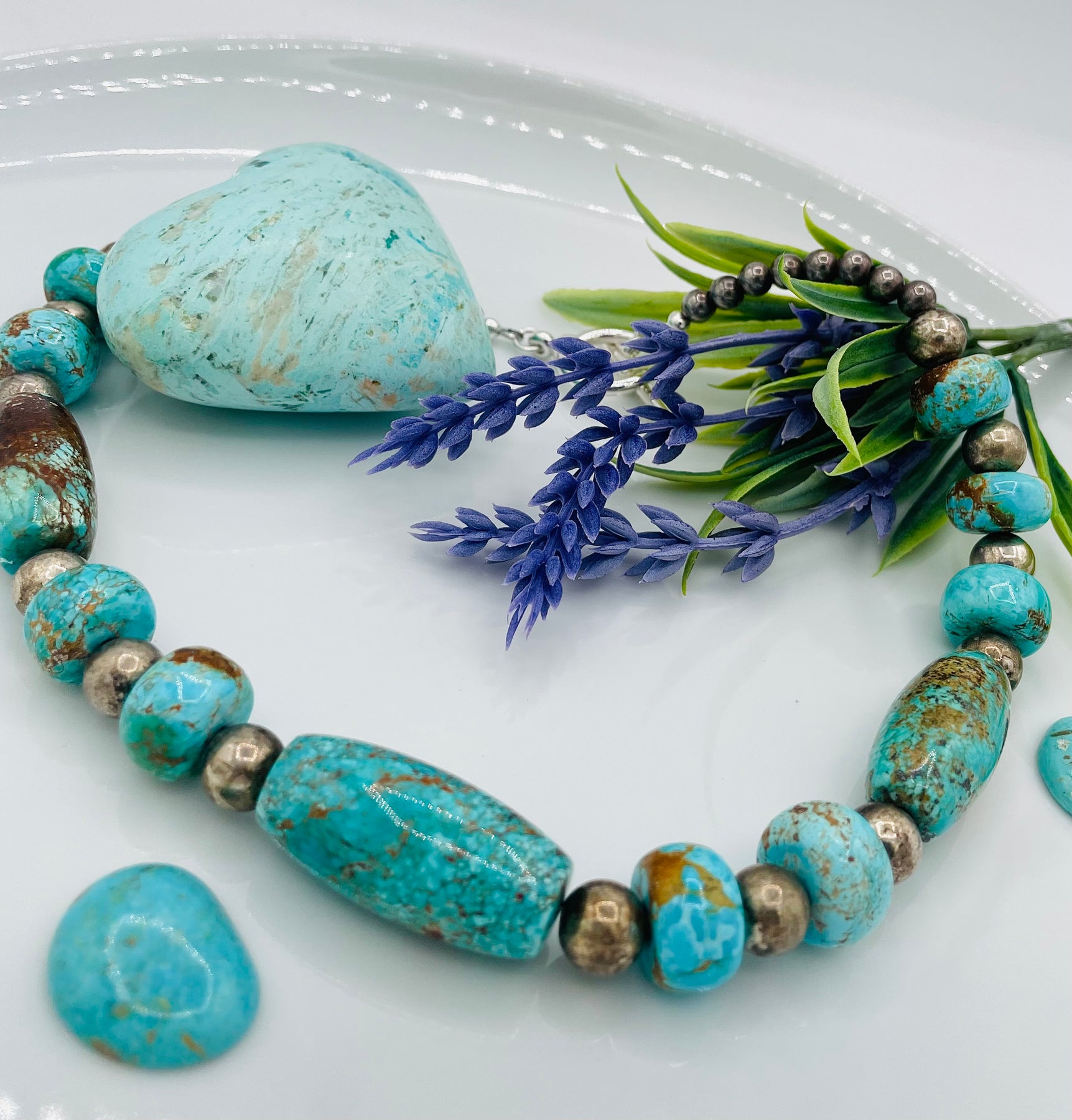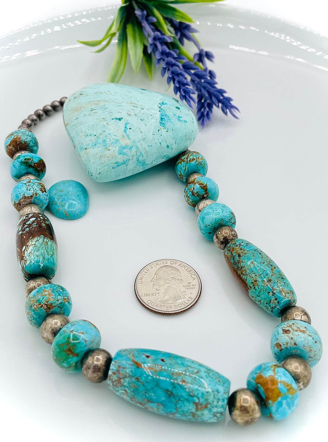This handmade necklace features gorgeous Zachary treated genuine Turquoise rondelles and barrels with sterling silver accents. This is beautiful quality Turquoise with gold matrix and measures 18 inches in length with a sterling silver toggle Clap.