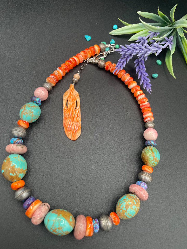 Kingman turquoise, rhodochrosite, spiney oyster, and sterling silver necklace set with matching earrings. Available only from Rockstar Cowgirl online or in store in Cody, Wyoming.