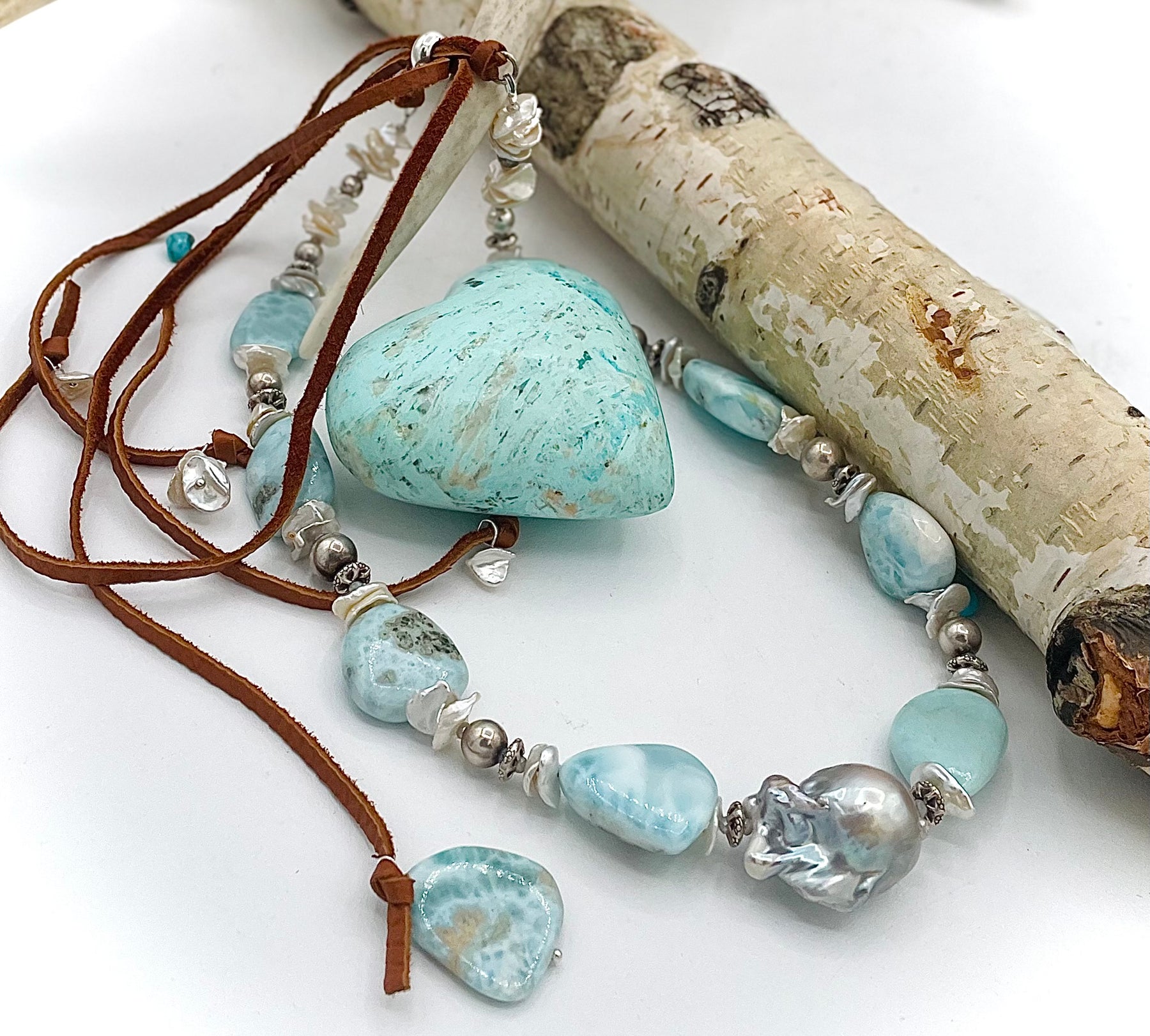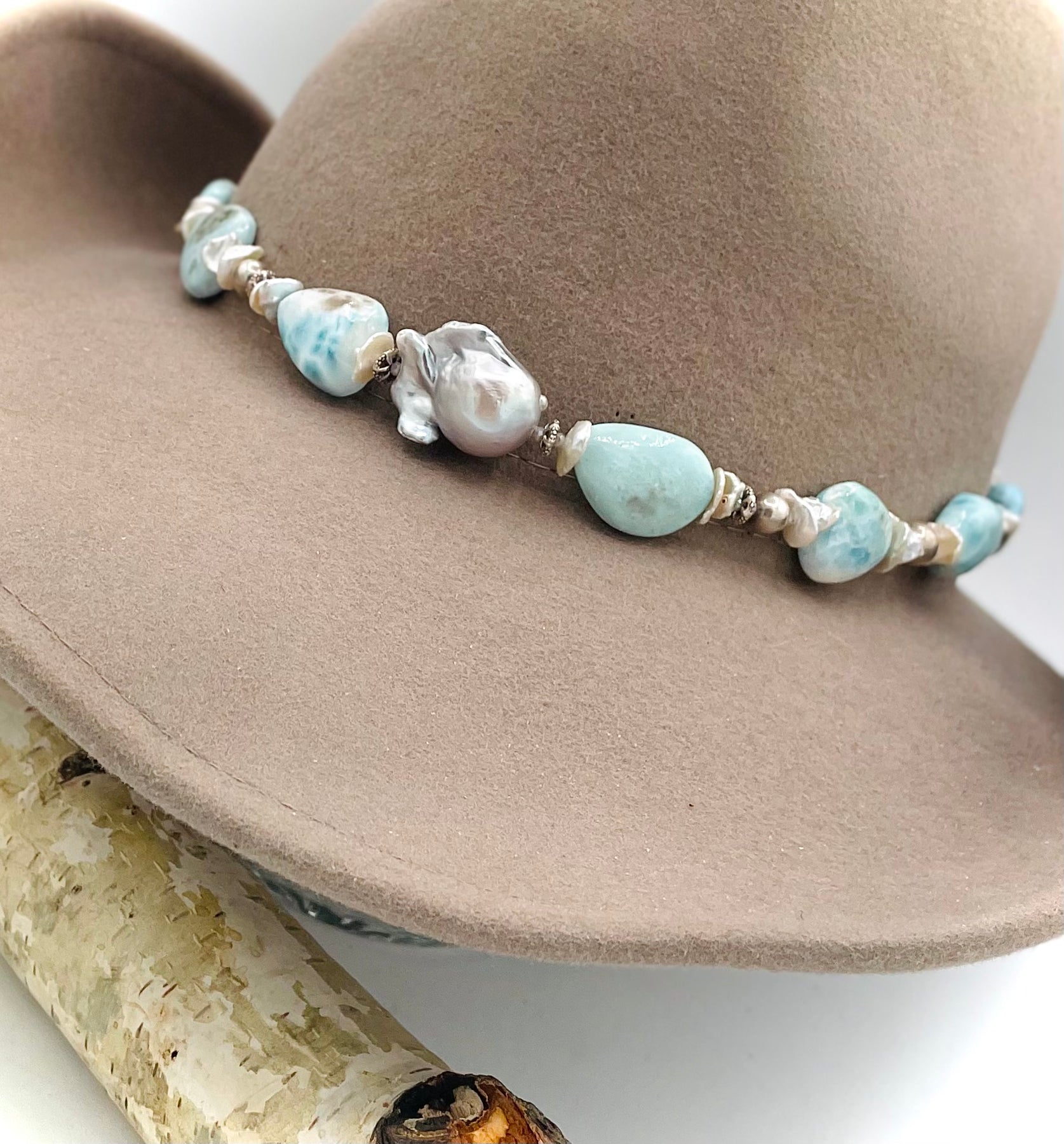 This handmade piece features a beautiful combination of blue Larimar from the Dominican Republic and gorgeous pearl accents. The centerpiece is a large flame ball pearl with sterling silver and glass crystals. This hat band measures 18” in length with an additional 16” of deer lace on the back with adjustable silicone slide bead. It can be worn at any length to fit any size hat or neck.