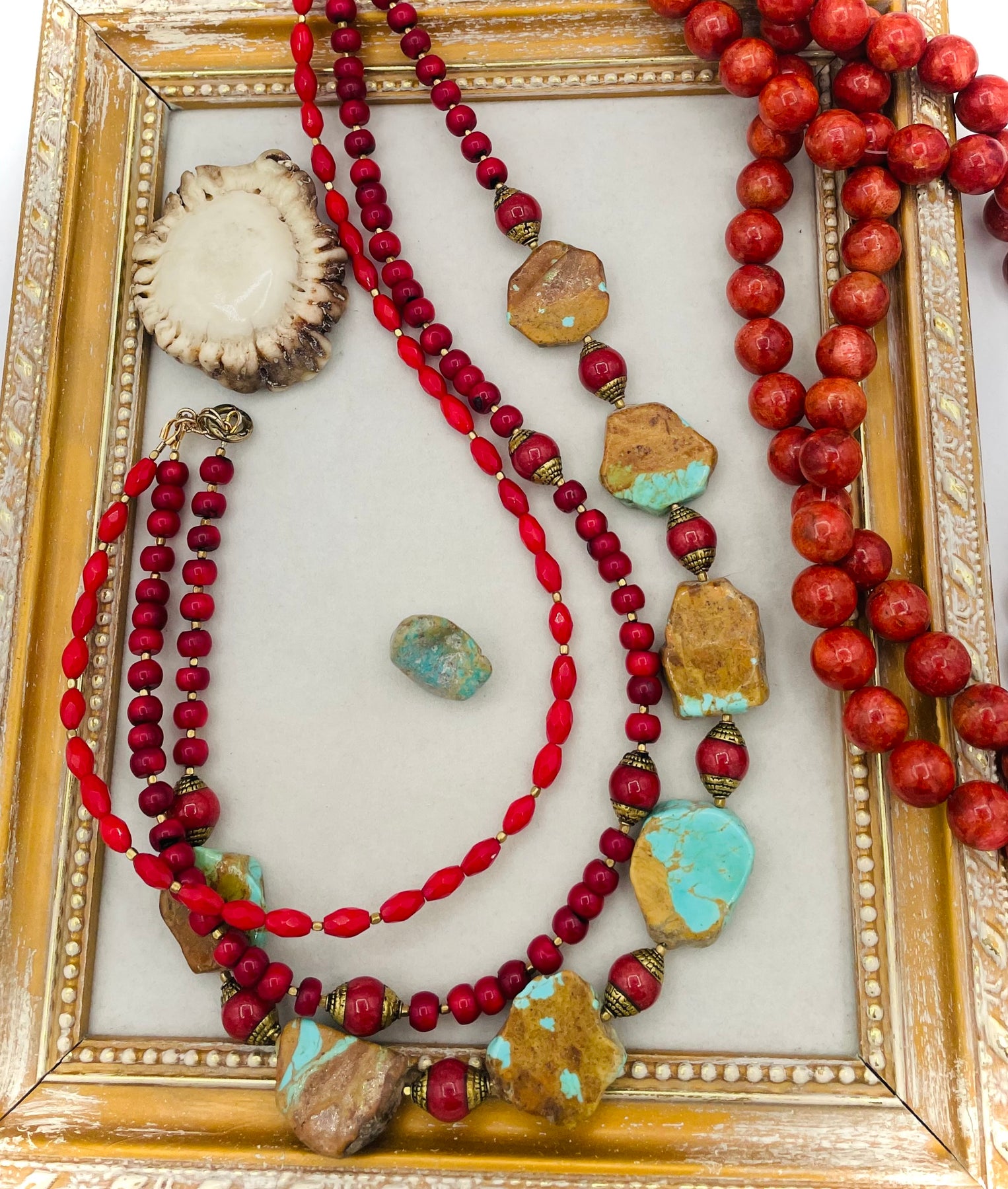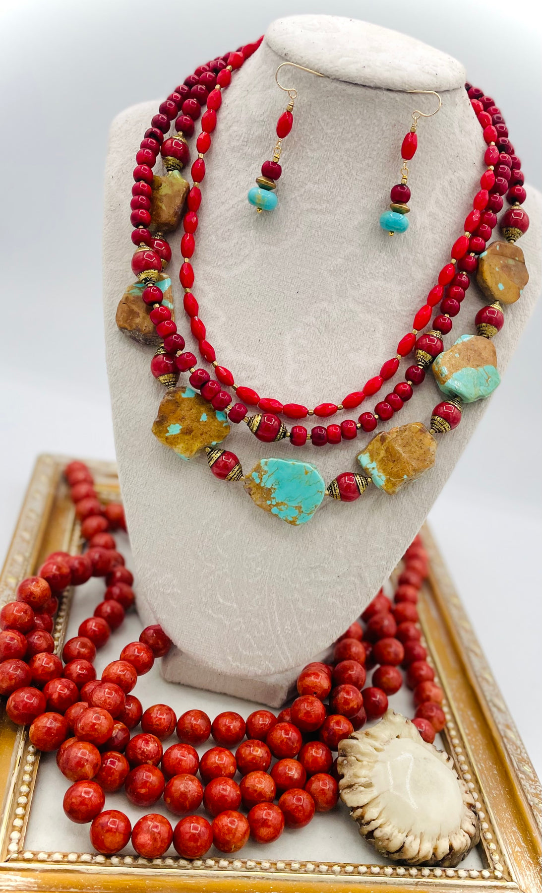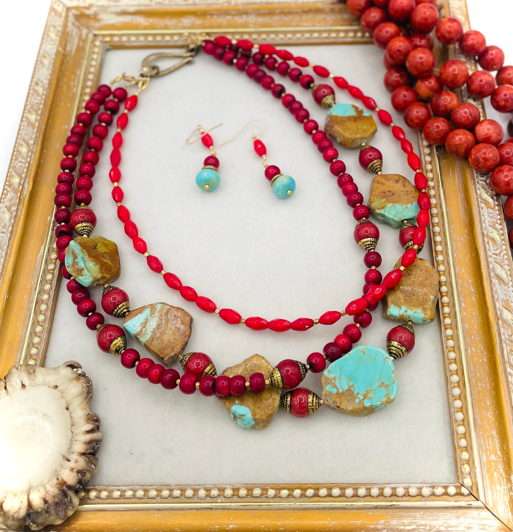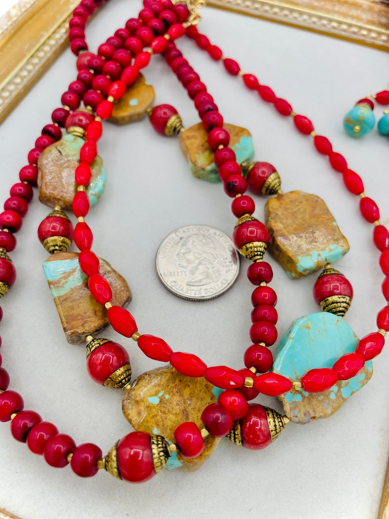 This handmade necklace features 3 strand of red coral and Kingman turquoise slabs with African brass accents. The necklace measures 17.5” to 19.5” in length and the earrings measure 2” in length with 14k gold ear hooks.