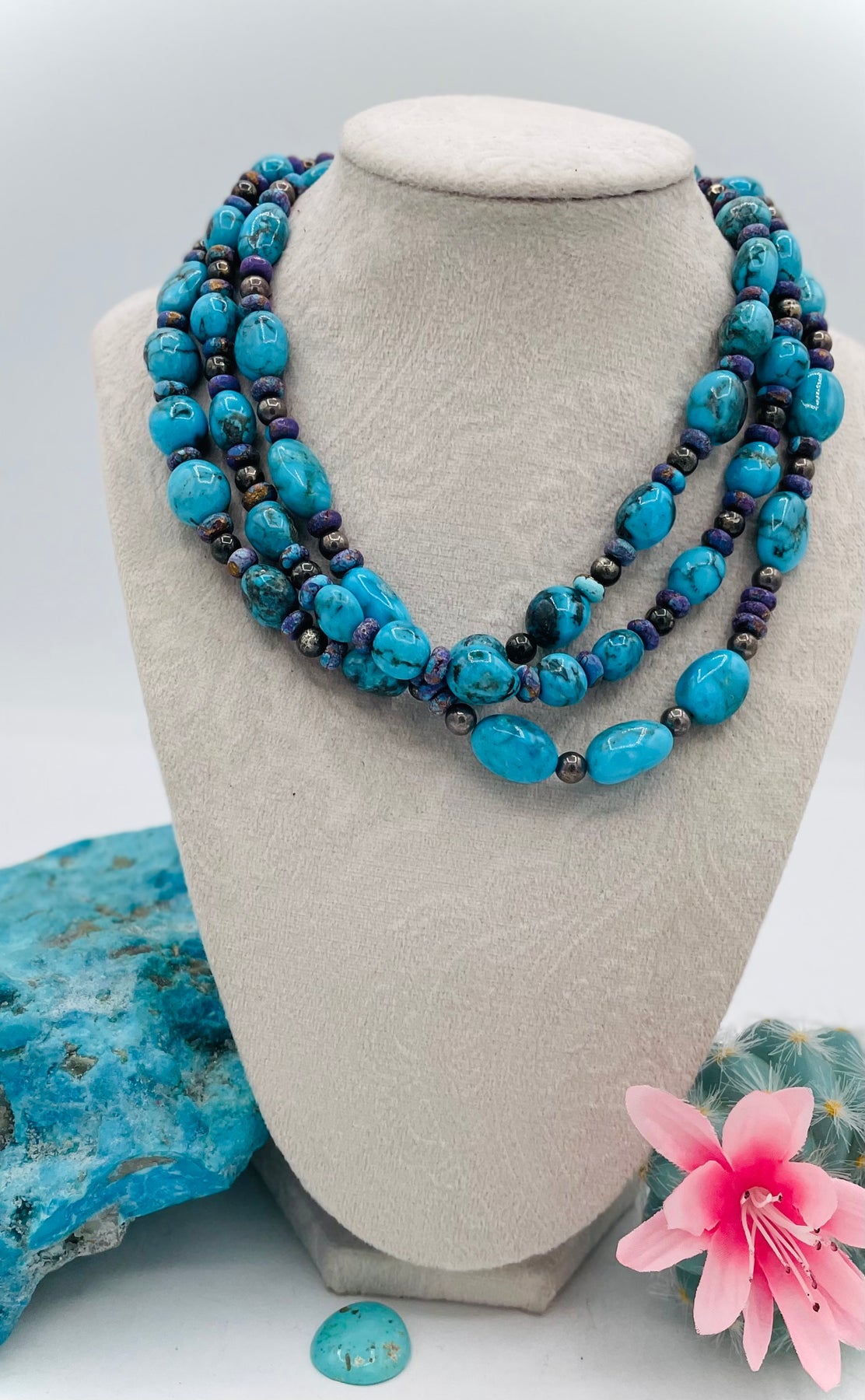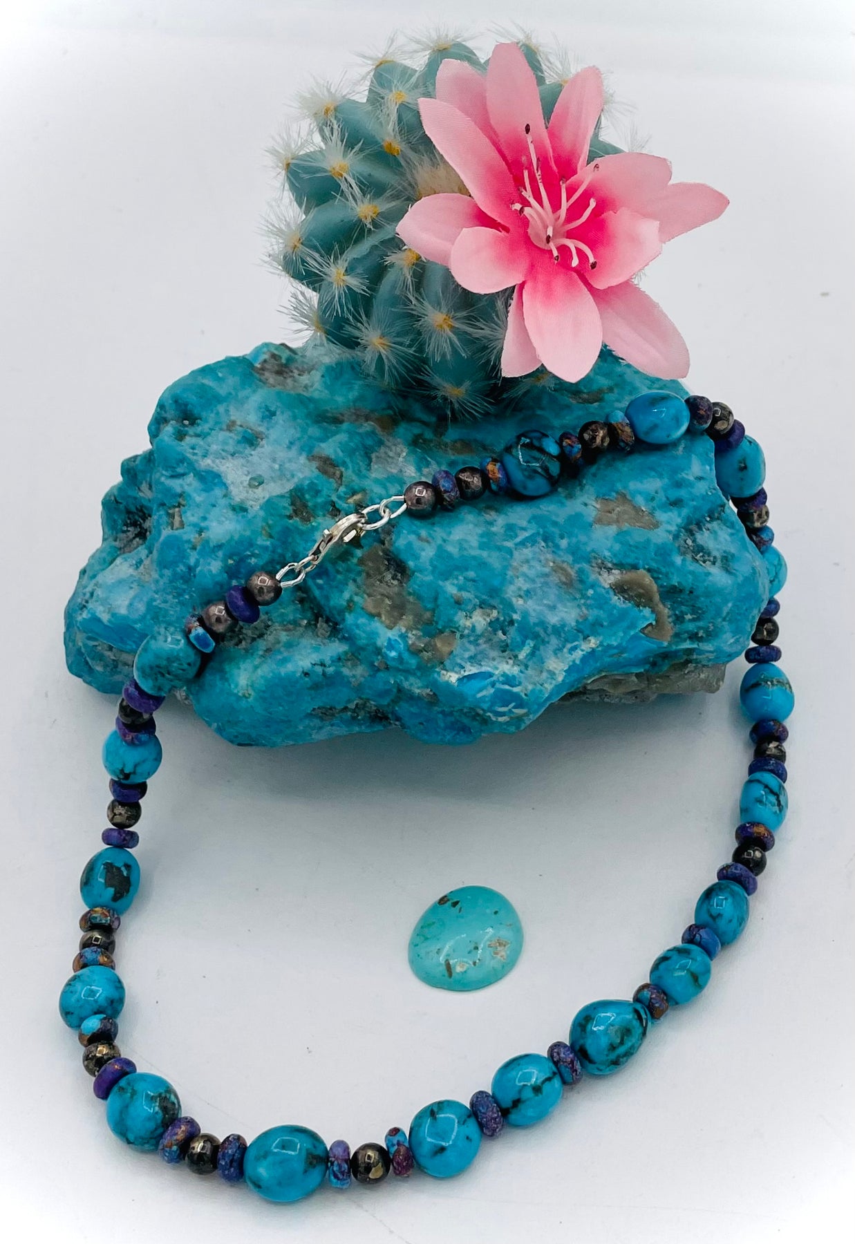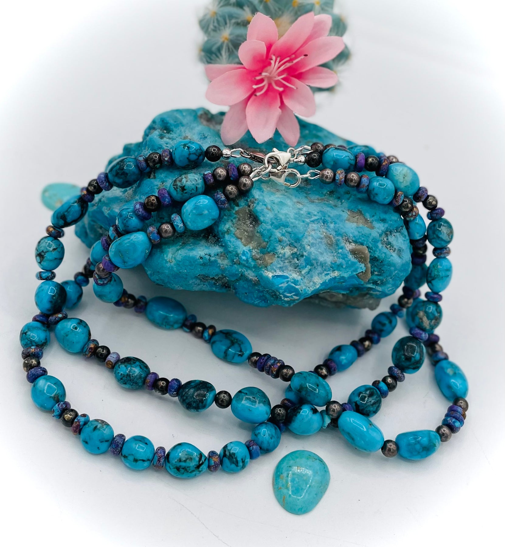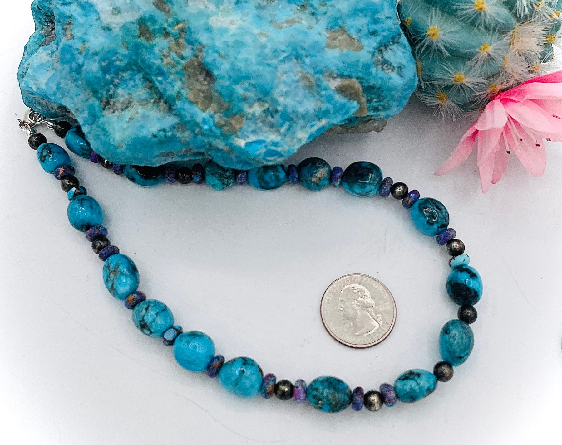 These handmade necklaces feature beautiful smoky Kingman turquoise with purple Mohave Turquoise and sterling silver accents throughout. Each necklace is sold separately and picked at random. These necklaces measure around 16 inches and can be customized to any length.