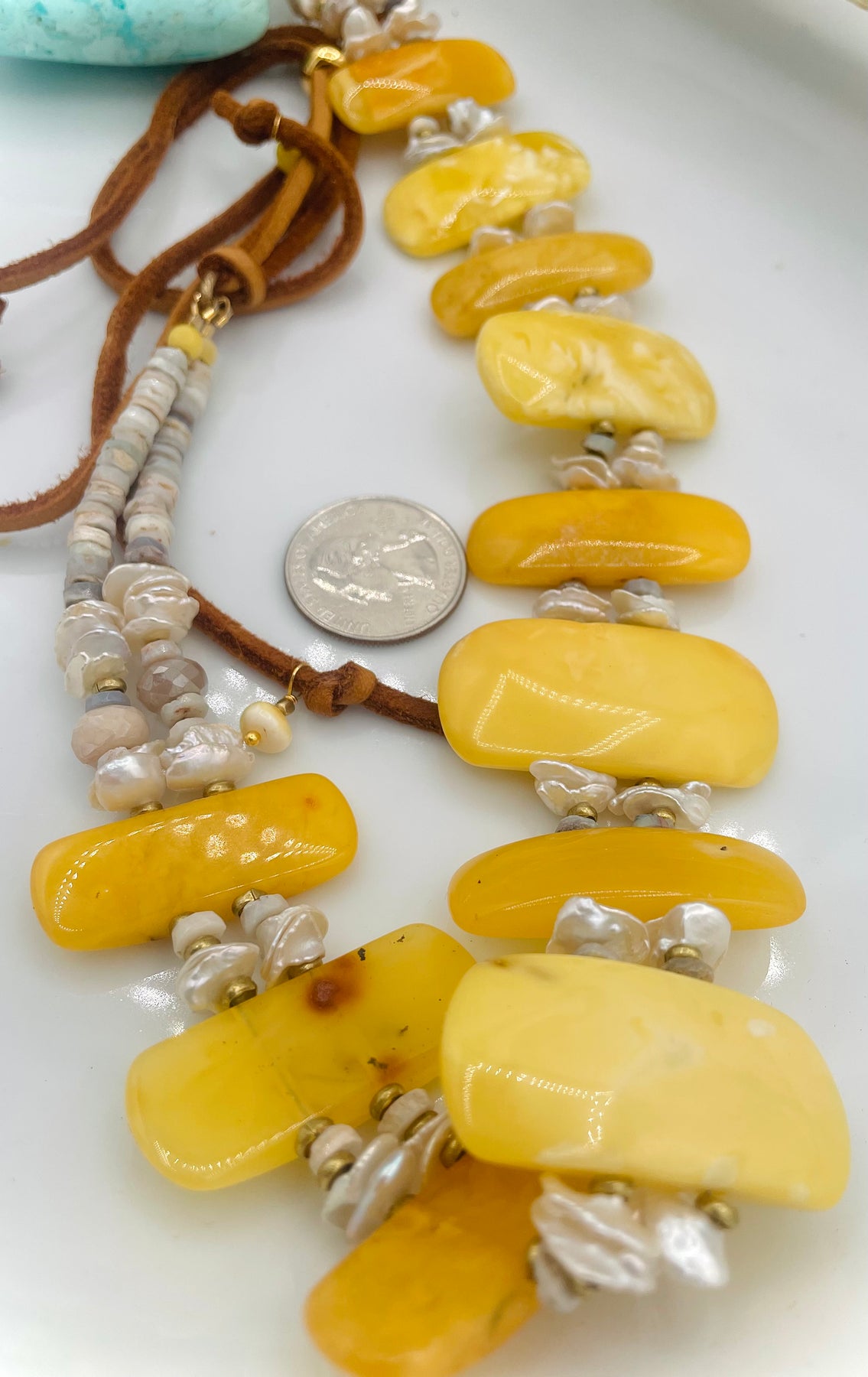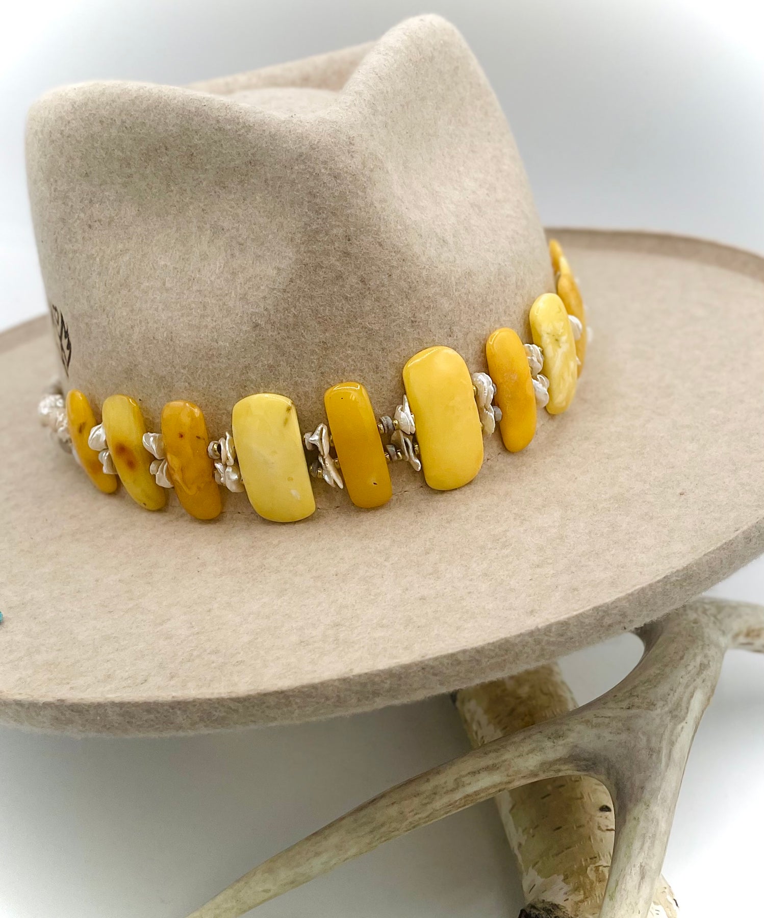 This handmade piece features beautiful yellow amber with Heishi pearls and lavender jasper. It has African brass accents and a gold silicone bead on the back. It measures 17” in length with an additional 16” of adjustable deer lace on the back and a silicone slide bead. It can be adjusted to fit any size hat or neck.