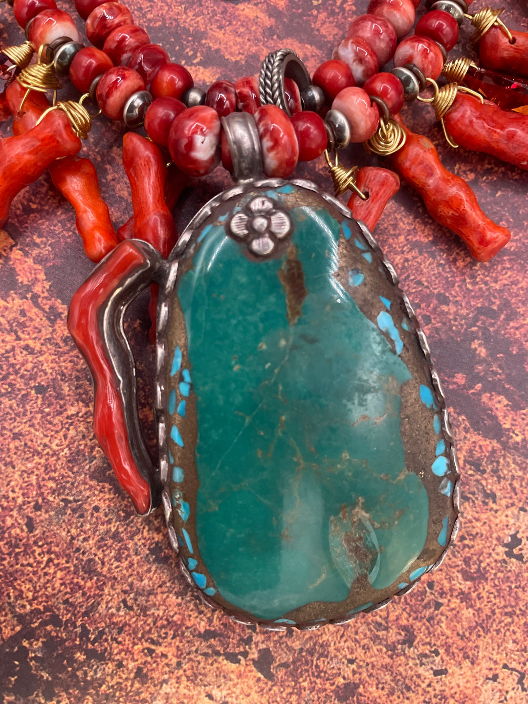 This featured piece was designed by Lala. The Tibetan turquoise is in sterling silver and measures about 70 mm. The necklace measures 24”. She incorporated red spiny oyster beads, sponge coral, Swarovski crystal coral beads, Tibetan turquoise, sterling Navajo pearls, and is finished with a hammered sterling Hilltribe hook and eye.